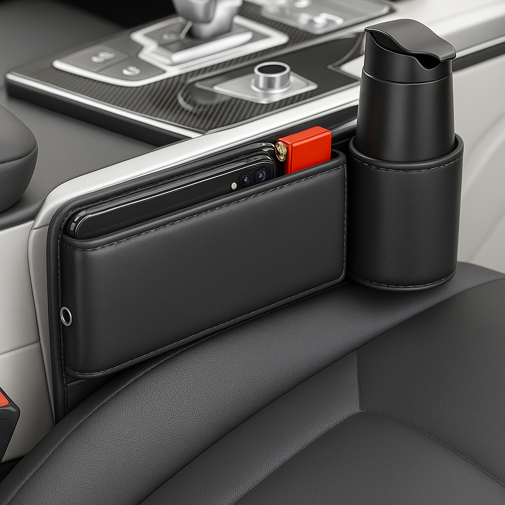 Mael exploite l’espace oublié entre le siège et la console pour offrir un rangement élégant, discret et toujours à portée de main. Conçu en cuir traditionnel haut de gamme, il allie sobriété et praticité, pour que vos essentiels trouvent naturellement leur place. Compact mais généreux, il accueille téléphone, clés, cartes ou bouteille, sans encombrer l’habitacle.